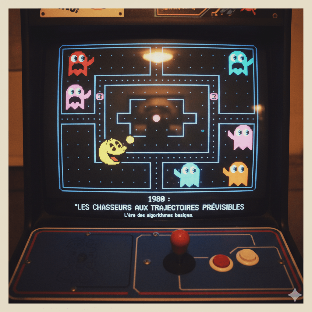 Si l’Intelligence Artificielle atteint aujourd’hui des sommets de complexité grâce à des innovations majeures comme l’apprentissage automatique, sa présence dans le jeu vidéo remonte aux prémices mêmes de cette industrie. Le premier exemple notable d’une IA de jeu fut l’ensemble d’algorithmes simples régissant le comportement des ennemis, comme les quatre fantômes de Pac-Man en 1980, surnommés « Les chasseurs aux trajectoires prévisibles », du fait de leur dépendance à des règles de mouvement basiques et répétitives.